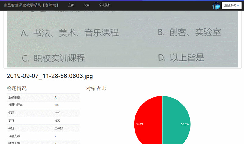 老師通過視頻采集書本題目,啟動客觀題答題功能,學(xué)生根據(jù)拍照的題目進(jìn)行ABCD或?qū)﹀e進(jìn)行答題。答完題后,老師公布答案,系統(tǒng)根據(jù)答案進(jìn)行即時自動分析。