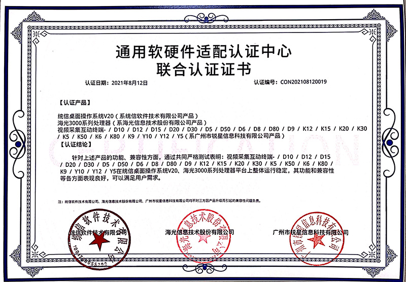 海光認證證書(無線視頻展臺、視頻采集互動終端)